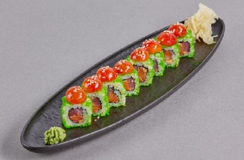 Филе тунца, снежный краб, авокадо, огурцы и икра масаго. Плюс имбирный дрессинг